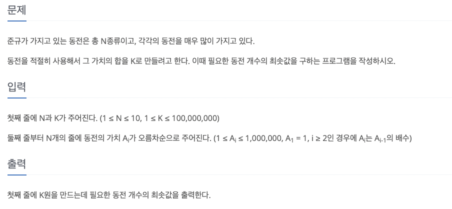 if문으로 동전의 배열을 도는 대신 for문으로 뒤에서 앞으로 순회한다. 해결방식은 역으로 price 보다 작은 동전들이 while 문에 걸리면 price가 동전 값보다 작아질 때까지 카운트하고 탈출한다.