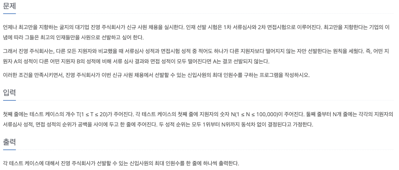1차 시험을 기준으로 오름차순 정렬한다. 1차 시험의 1등은 2차 시험의 등수와 상관없이 항상 합격이기 때문에, 1등을 카운트해놓고 시작했다. 2차 시험에서 앞사람보다 등수가 높기만 하다면 등수가 몇인가는 상관없이 합격이기 때문에 별도로 2차 시험 등수를 정렬하거나 값을 고려하진 않았는데 테스트 케이스는 통과하지만 제출 시 40%쯤에서 틀리게 된다. 어떤 예외 케이스를 해결하지 못한 건지는 아직 알지 못했다.