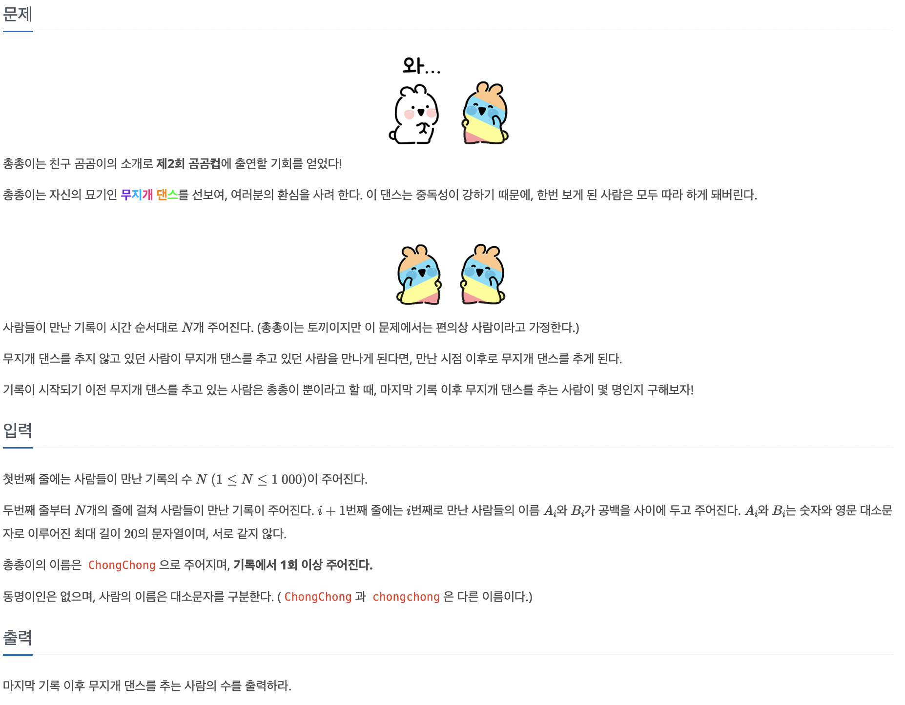 첫 번째 방법은 일단 춤을 춘 사람이면 모두 dance 배열에 넣고 중복을 제거하는 작업을 한 번 더 해야 했다. 처음부터 중복해서 dance에 들어가지 않도록 Set을 사용해 size로 길이만 출력해주었다.