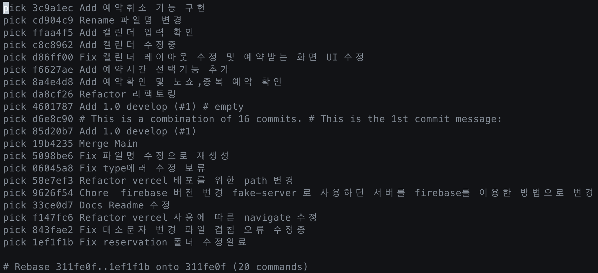 바꾸고자 하는 log가 있는 곳만큼 HEAD~ 뒤에 숫자를 넣어 편집할 수 있는 화면으로 넘어온다. 20을 입력했기 때문에 log 20개와 각종 커맨드들을 확인할 수 있다.