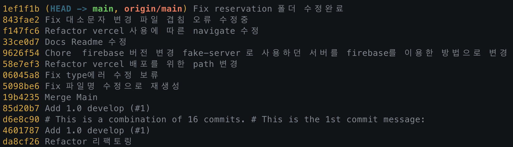 log를 볼 때 --oneline 옵션을 추가하면 간단하게 커밋과 메세지만 확인할 수 있다. 예시를 위해 위 로그 중 06045a8 ~ 4601787 까지의 커밋을 합쳐보려 한다.
